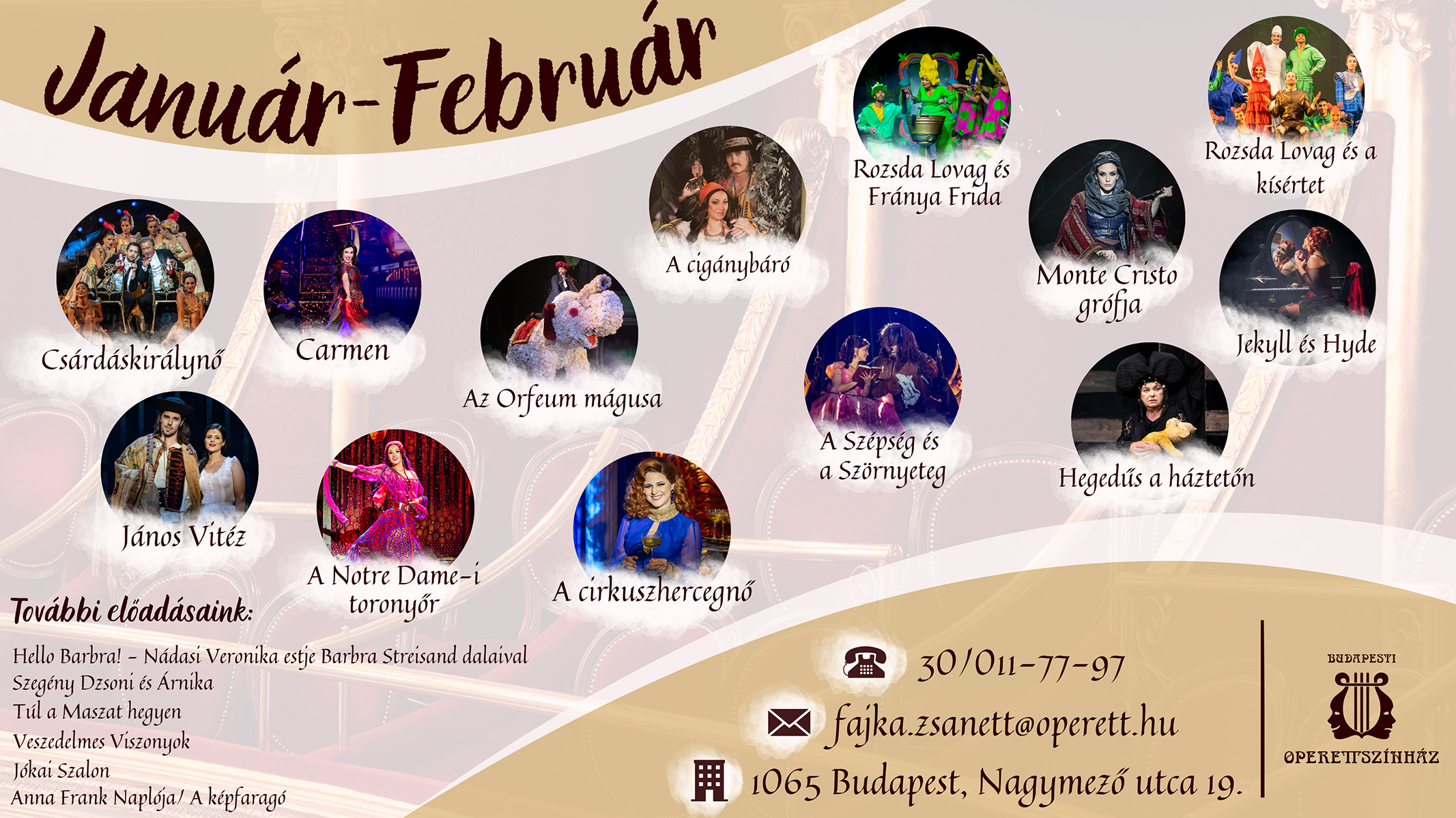 Januárban és februárban visszatérnek szeretett musical és operett előadásaink. Kezdjék nálunk Új Évet olyan nagy klasszikusok társaságában, mint a Notre Dame-i toronyőr, A Szépség és A Szörnyeteg, Az Orfeum mágusa, a Csárdáskirálynő vagy a Hegedűs a háztetőn…