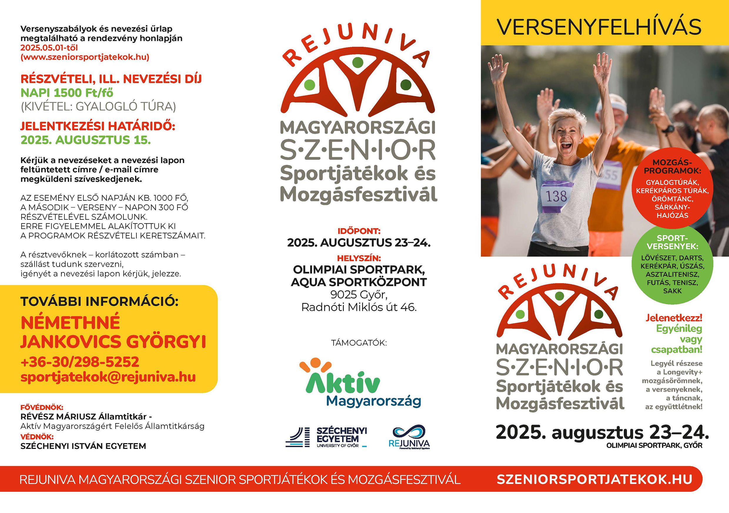 Augusztus 23–24-én az Olimpiai Sportpark, Aqua Sportközpontban (9025 Győr, Radnóti Miklós út 46.) REJUNIVA Magyarországi Szenior Sportjátékok És Mozgásfesztivál