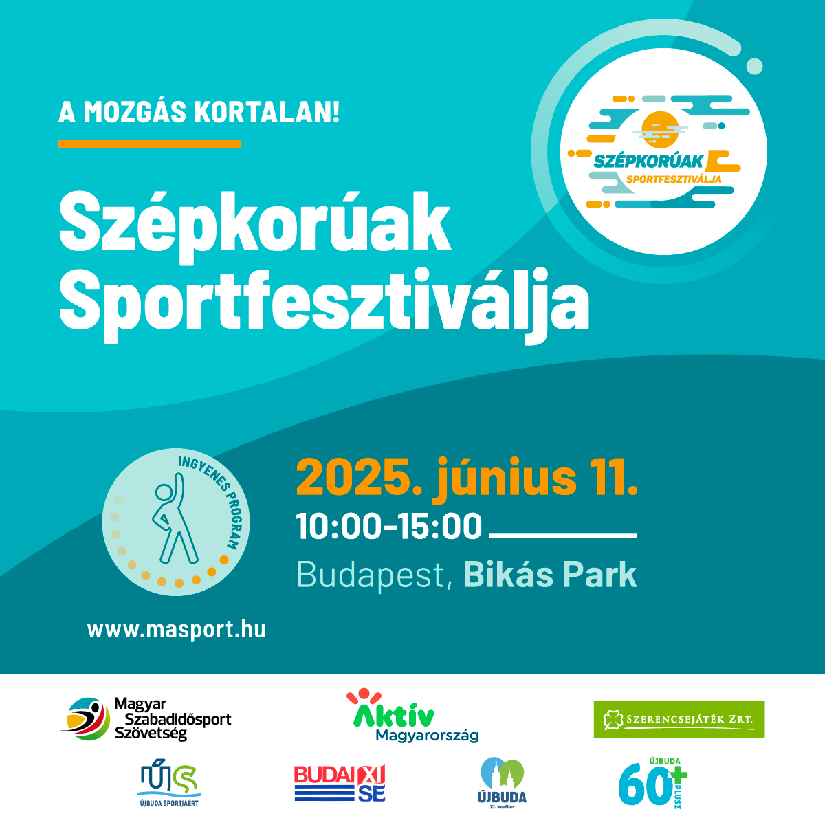 A Magyar Szabadidő Szövetség idén XVI. alkalommal rendezi meg a 2 000 főt megmozgató ingyenes Szépkorúak Sportfesztiválját június 11-én szerdán, Budapesten, a Bikás Parkban.